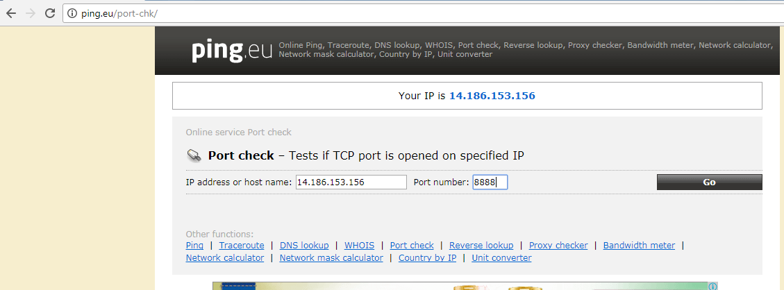 10.Sau khi mở port xong tiến hành kiểm tra port và tên miền bằng cách Đối với port: Mở trình duyệt web> vào trang Ping.eu > port checkNếu có thông báo open thì đã mở port thành côngNếu có thông bác sclose thì port chưa mở được, kiểm tra lại các bước trên