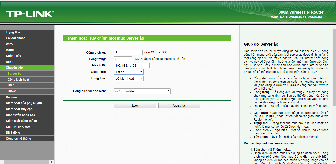 Đăng nhập vào modem. Tên đăng nhập và mật khẩu được ghi phía sau của modemSau khi đăng nhập thành công vào modem chúng ta vào tab Chuyển Tiếp > Server ảo để mở portĐối với dòng dòng 8400 sử dụng phần mềm Superlivepro chúng ta mở 2 port là TCP port 6036 và HTTP Port 81