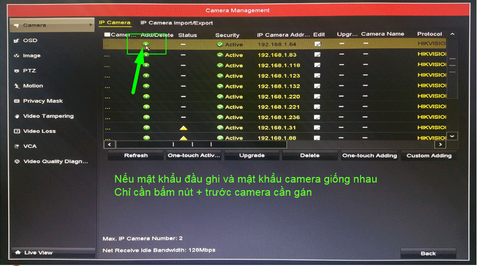 One-Touch Active để kích hoạt các camera (Báo trạng thái Inactive màu đỏ)
