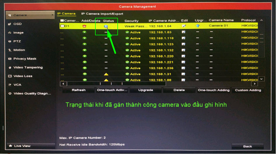 Sau khi gán camera IP vào đầu ghi HIKVISION thành công dòng status sẽ hiện biểu tượng Play